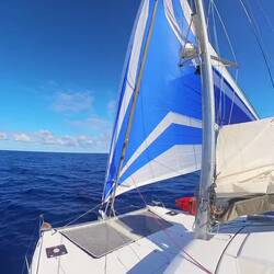 Nach dem Mittag ließ der Wind etwas nach. Damit war die Zeit gekommen, den Trumpf zu ziehen, und der stach wieder: Unser Blauweißes ließ wieder die Lachfalten in meinem Gesicht erscheinen. Mit bis zu sieben Knoten im 10 min. Durchschnitt glitten wir jetzt wieder dahin. Da macht das Segeln doch gleich wieder viel mehr Freude. Wenn es hinten am Achterdeck so richtig rauscht und nicht nur plätschert, dann sind wir richtig unterwegs. Bis kurz vor Mitternacht zog es uns über den Ozean. Kurz vor meinem Schichtende um Mitternacht zog plötzlich der Wind an. Zum Glück hatte ich einen Alarm eingestellt, denn so bekam ich es direkt mit. Ein kleiner Squall, auf dem Radar schwer zu erkennen, zog direkt an unserer Seite vorbei. Schnell holte ich das Segel ein, ist ja mit unserem neuen Endlosfurler kein Problem und schnell gemacht. Weiter ging es mit Genua und Groß. Der Wind sollte ja eh auffrischen und der Segelwechsel hätte ohnehin angestanden.