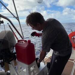 Nach dem Frühstück packten wir dann wieder mal unseren Levante aus. Dies war im Nachhinein eine gute Wahl. Wir segelten mit Wind von Achtern ziemlich genau auf dem 5. Breitengrad entlang. Links von uns entwickelte sich ein Wolkensystem mit einigen Squalls. Werner segelte einen südlicheren Kurs und bewegte sich hinein. Später berichtete er von einigen Squalls, denen er hatte ausweichen müssen. Wir hatten keinen einzigen. Schließlich war es nachmittags so ruhig, dass wir es wagten, unsere Äquatortaufe nachzuholen. Erst die Ansprache, dann das Wasser. Lustig war’s!