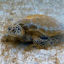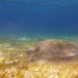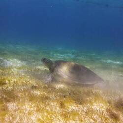 Die Tiere sind so zutraulich, dass sie vom Abrupfen und Kauen des schütter am Meeresboden wachsenden Grases nur behäbig aufblicken, wenn man sich schwimmend nähert, um dann gelassen weiterzufressen. Andrea hat an einem Morgen 13 Schildkröten auf einmal gezählt. Dazu kam für uns noch als Highlight ein Adlerrochen, der mit seiner Breiten Schnauze im Sandboden herumschnüffelte. Noch nie hatten wir ein Exemplar so nah gesehen! Von den Malediven kannten wir die Tiere zwar, die auch gern in Gruppen schwimmen, aber dort sind sie scheu und kommen kaum nah heran.