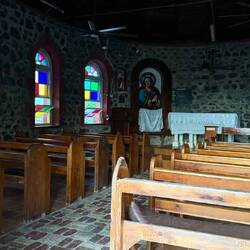 Die gemauerte Kirche entstand 1930 durch die Initiative eines Benediktinermönches, der, nachdem alle vorherigen Holzkirchen durch Feuer oder Sturm vernichtet worden waren, in Belgien einen vierwöchigen Maurerkurs absolvierte und seine neuen Kenntnisse den Einwohnern vermittelte. Seit fast 100 Jahren hatte sie nun dort gestanden und diente mit den Nebenräumen auch als Grundschule. Wir trafen dort Kinder und die Lehrerin, die gerade Feierabend hatten, sowie eine ältere Dame, die uns Postkarten schenken wollte.