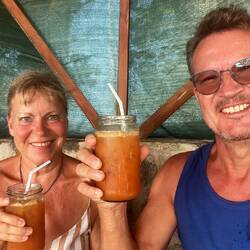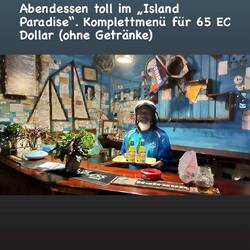 Abends speisten wir zweimal bei James im „Island Paradise“, jeweils mit Freunden. Den liebevoll gedeckten Tisch incl. blauer Stofftischdecke und Porzellan sowie das gute Essen zu fairem Preis werden wir nie vergessen. Am 2. Abend spielten im Nebenraum einige Männer Karten, auch mit Einem von Ihnen sprachen wir.