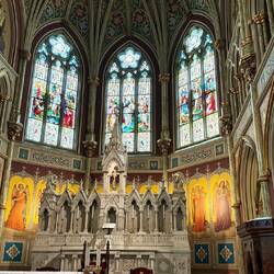 Der nächste Programmpunkte war die Besichtigung der Kathedrale, welche vom Papst Pius IX. sogar zu einer Basilika minor erhoben wurde. Diese wurde im 19. Jahrhundert vom Architekten James Roosevelt Bayley im Neugotischen Stil geplant und 1873 fertiggestellt. Die Türme wurden 1896 hinzugefügt. Die Neugotik zählt zu den frühsten stilistischen Unterarten des Historismus. Viele Stilelemente sind der Gotik entnommen, die Spuren der Jahrhunderte, die diese Kirchen sonst aufweisen, fehlen hier jedoch. Die tollen Buntglasfenster wurden in Innsbruck hergestellt, die vier Seitenaltäre bestehen aus weißem italienischem Marmor. Uns hat die Kirche sehr gefallen. Neugotische Bauwerke werden uns auch in New York bald wiederbegegnen.