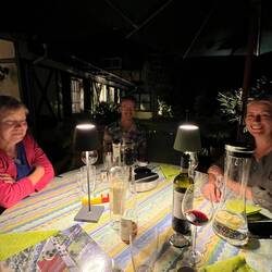 Um kurz nach 17:00 Uhr mussten wir dann doch den Motor anwerfen, da uns der Wind fast gänzlich verlassen hatte. Wir hatten aber auch nur noch 4 NM vor uns. Als Ankerbucht hatten wir uns die Bucht mit dem Piratenfelsen gewählt. Gerade als wir den Anker fallen ließen kam ein Schlauchboot längsseits und machte uns darauf aufmerksam, dass am nächsten Tag in der Früh ein Tankschiff mit Trinkwasser käme und wir diesem im Weg seien. Also Anker wieder hoch und einen neuen Platz gesucht. Das war aber leider nicht so einfach. Die nächsten Buchten waren belegt oder nicht geeignet. Ich beschloss, wieder umzudrehen und erneut unser Glück zu versuchen. Ich ankerte in der Nähe der anderen Boote, und wieder kam der Mann mit dem Schlauchi. Da wir ihn ignorierten - andere Boote lagen schließlich auch da - kam er etwas etwas später mit der Portpolice an, gerade zu dem Zeitpunkt, als wir ins Schlauchboot stiegen, um zum Abendbrot zu fahren. Es lief aber alles ganz nett ab. Wir einigten uns darauf, dass wir am nächsten Tag um 6:00 Uhr unseren Anker lichten würden. Zum Abendessen gab es bei mir Ziege aus dem Ofen mit Bratkartoffeln, total lecker. Das Fleisch ist hell, etwa wie Schweinefleisch, in dieser Zubereitung total zart.