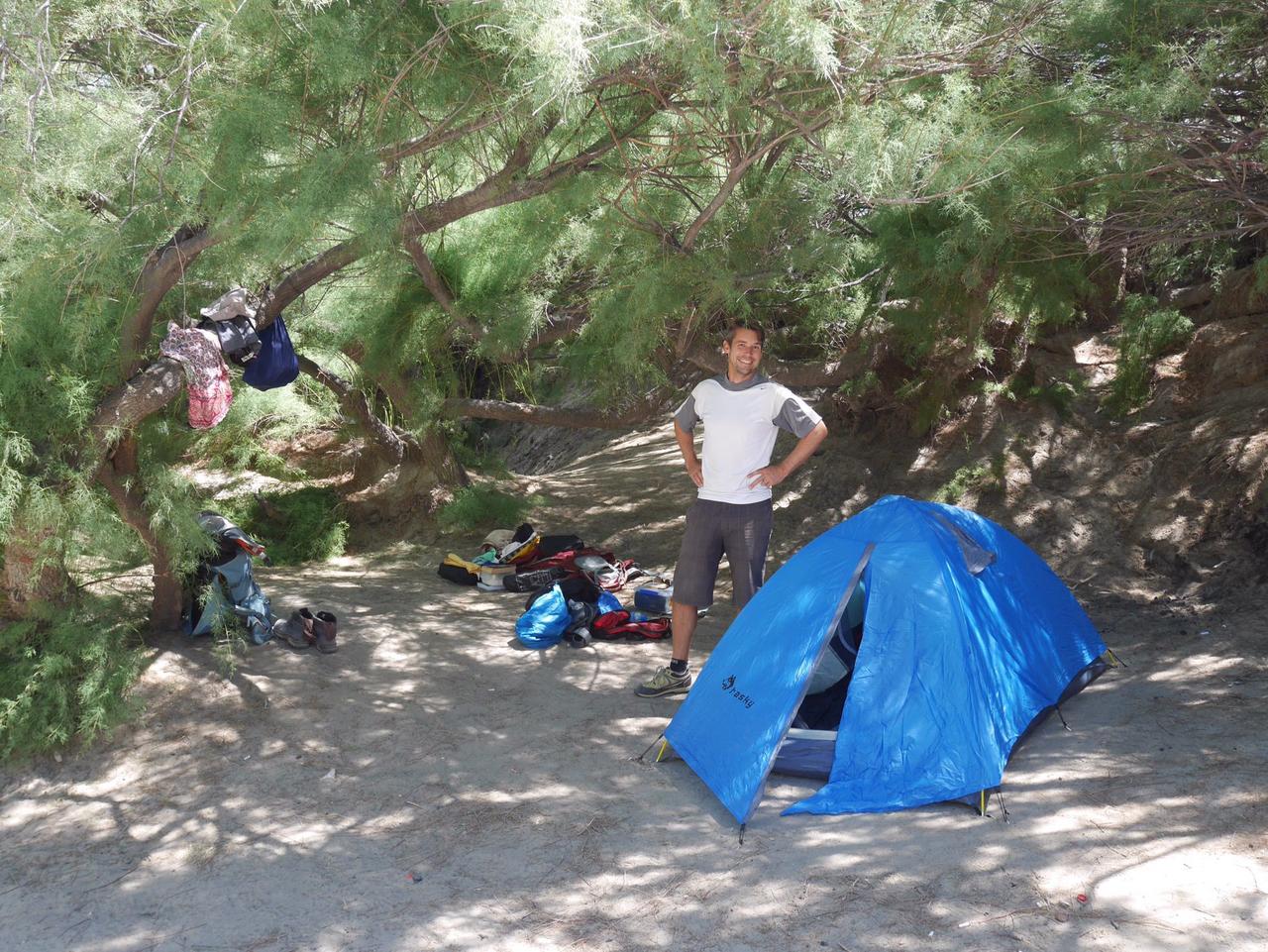 Setting up our tent, a short walk to the waterfall and Schnitzel.
