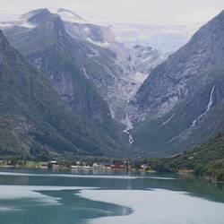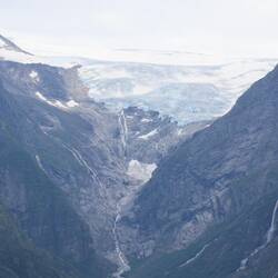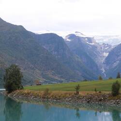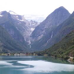 Trois petits lacs successifs sont alimentés par le glacier de Briksdal, ce qui leur donne cette fameuse couleur turquoise laiteux. On ne se lasse pas de les contempler.