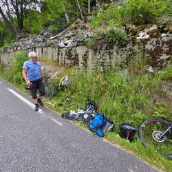 Cette ascension a plutôt bien commencé mais au bout d'un moment, je trouvais que c'était de plus en plus dur. J'ai mis ça sur le compte de la chaleur et du soleil torride. Je cherchais l'ombre, je dégoulinais. Mon vélo se traînait ! Et enfin, je m'en suis rendu compte : le pneu arrière était à plat. Eh bien, faire une réparation sur le bord d'une route étroite, en pente et de surcroît touristique, c'est pas évident. Trouver la fuite en remplissant ma casserole d'eau : opération réussie mais j'ai mal positionné la rustine. Allez, redémonte ton pneu, apprenti ! Hé les voitures...roulez pas sur ma chambre à air 🫣 Un cycliste norvégien s'arrête à ma hauteur : est ce que j'ai besoin d'aide ? Pourquoi pas...il me propose une chambre à air neuve...mais trop large. Pendant que je répare ma chambre à air, il monte sa chambre sur mon pneu : et ça marche ! Bin, j'aurai une chambre à air de rechange. Merci l'ami ! Il sappelle Kjetil. J'attends que tu m'envoies le selfie qu'on a fait....mais pour le recevoir, il faudra du réseau 🤣