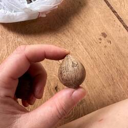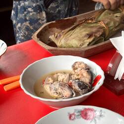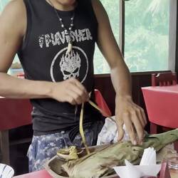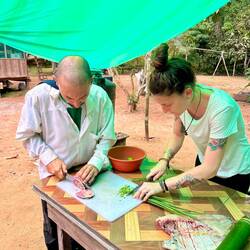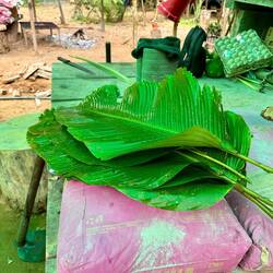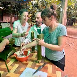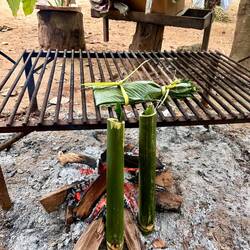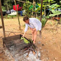 Am zweiten Tag ziehen wir morgens los, um Blätter (es muss eine bestimmte Art sein), Bambus, eine Seilalternative aus einer Pflanze und Knoblauchrinde (die Rinde des Baums riecht und schmeckt wieBaca lagi