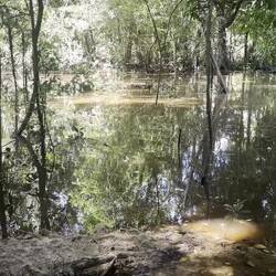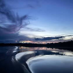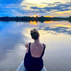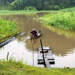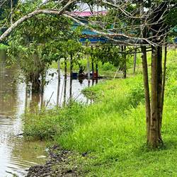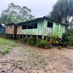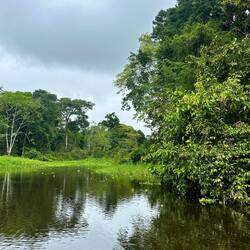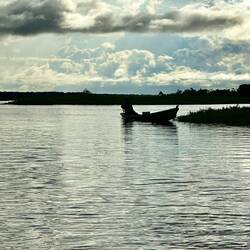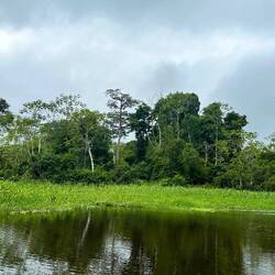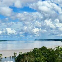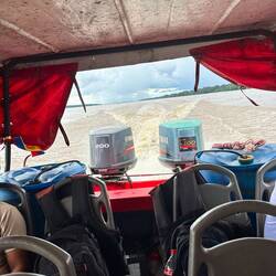 Mit dem Boot sind wir über den Amazonas gefahren. Momentan ist er sehr breit und hat viel Treibgut, überall schwimmen Baumstämme herum.