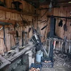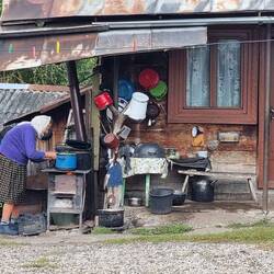 In einem Hof erkennen wir eine alte Frau, die auf dem draußen stehenden Herd die geschälten Kartoffeln kocht und uns freundlich anlächelt. Wenige Häuser weiter wird geräuchert. Aus einem Schuppen wird der Rauch über ein Rohr für alle sichtbar in die Umgebung geleitet. Neben dem Schuppen ist eine ältere Dame damit beschäftigt, das Gemüse für das Mittagessen vorzubereiten.
