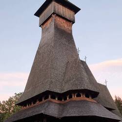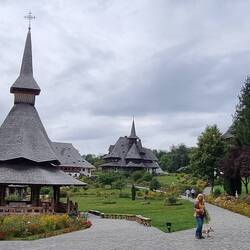 Zum Übernachten fahren wir weiter nach Sapanta. Hier halten wir vor dem Peri-Kloster, des Erzengels Michael, von Sapanta an. Mit 78 m Höhe ist das Kloster das höchste Eichenholzbauwerk der Welt.