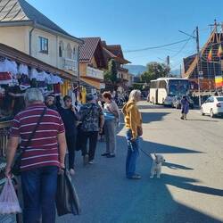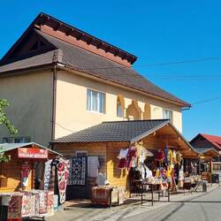 Zunächst fällt von weitem die bunte Kirchturmspitze auf. Dann sieht man die ersten Verkaufsstellen. Einheimische bieten traditionelle Mode und rumänische Leckereien an.