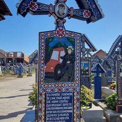 Den fröhlichen Friedhof zeichnen die bunten "Grabsteine" aus, die keine sind. Da Holz als  Material zum Einsatz kommt. Auf den ca. 800 Holzkreuzen sind teils Fotos und Bilder und aufwendige als auch farbenfrohe Schnitzereien der Verstorbenen auf der Vorder- und Rückseite angebracht, welche über das Leben der Verstorbenen berichten. Verse auf den Holzstelen erzählen positives ebenso wie negatives über die Person. Diese individuellen Holzkreuze sind in der Tat etwas besonderes und sehenswert.
