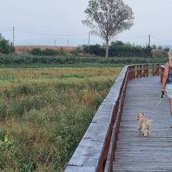 Weiter geht es dann über die Stege flussaufwärts. Da der Abstand der Stegplatten sehr stark variiert und Pepe sich darin mit seinen Pfoten verfangen kann, wird Pepe abwechselnd von uns getragen.