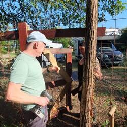 Der Besitzer hat gleich eine Lösung parat. Er drückt Manuela einen Rechen in die Hand. Sofort zeigt er ihr, was und wie zu tun ist.
