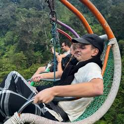 Als wäre die Wackelbrücke nicht genug, führte uns der Weiterweg erneut über das Tal. Dieses Mal aber sitzend. Man konnte sich wie auf einem Stuhl hinsetzen oder im Schneidersitz platzieren und wurde mit einem Gurt befestigt. Dabei sind fünf Sitzplätze nebeneinander, die einander nicht berühren. Somit ist jeder alleine in der Luft schwebend und hat einen Rundumblick.