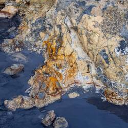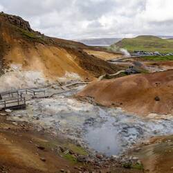 Nachdem wir uns mit einem Kaffee & Zimtschnecke gestärkt haben, geht es weiter zur berühmten „Blue Lagoon“ - einem der Touristischen HotSpots hier überhaupt. Würde mich mal interessieren wer von den zig'tausenden Besuchern hier weiß, dass Sie eigentlich im Abwasser des Thermalkraftwerkes nebenan baden… Aber selbst wenn, dem Touristenstrom tut dies keinen Abbruch; der Parkplatz ist rappell voll und es ist ein reges Kommen & Gehen zu verzeichnen. Für uns ist der Massenansturm nix und so begnügen wir uns mit ein paar Fotos von dem hellblauen Wasser, welches durch das Lavafeld vor dem Hauptgebäude sickert, und fahren weiter zum Thermalgebiet Seltún. Hier dampft es überall aus dem Boden und Schwefelgeruch hängt in der Luft. Leider hat sich die Sonne wieder hinter einer Wolke versteckt und so kommen die Farben nur bedingt zur Geltung; da geben die Pferde auf der anderen Seite der Straße ein fast schon ansprechenderes Motiv ab 😏.