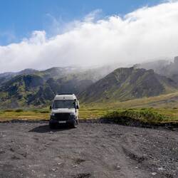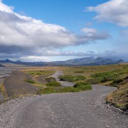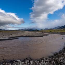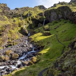Am Wasserfall Nauthúsagil angekommen, finden wir leider ein Schild "closed" vor 😯 und erfahren auf Nachfrage, dass dort gerade ein Film gedreht wird...! Also ist klar dass wir weiter ins Tal fahren, bei den genialen Ausblicken die sich jetzt bereits gezeigt haben. Bald kommen die ersten Furten und nach Beratschlagung trauen wir uns durch. Diesmal sind es alles Gletscherfurten und man sieht nicht wie tief es ist. Das ist schon spannend... Aber alle Furten die wir fahren klappen problemlos, aber dann ist für uns Schluss, als es deutlich tiefer wird und mehr Strömung gibt. Aber macht nichts. Die Ausblicke Richtung Þórsmörk sind phantastisch und wir wenden, um auf dem Rückweg noch zum Stigafoss hoch zu laufen. Eine schöne Wanderung und wiedermal sind wir alleine.
