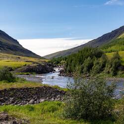 Also zurück bis zur Brücke und dann auf der anderen Seite wieder rein ins Tal. Leider ist auf der ersten Piste bereits nach kurzer Zeit Schluß an einem geschlossenen Gatter, also die nächste Piste probiert. Dort kommen wir um einiges weiter, aber letztendlich endet sie auch in einer Sackgasse auf einem Bauernhof. Somit fahren wir zurück und nehmen dann doch die Teerstraße zur Laugarfell Hütte.