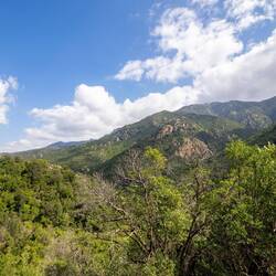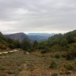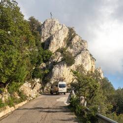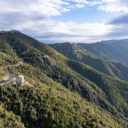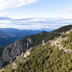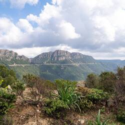Die Anfangs noch gut ausgebaute Straße wird, nachdem wir auf die SR445 abbiegen zusehends schmaler je höher wir kommen. Schnell ist man hier sowieso nicht unterwegs, jedenfalls wir nicht mit unserem Sprinter, dafür ist die Straßenführung einfach zu kurvenreich. Dafür gewinnt die Landschaft immer mehr an Reiz und plötzlich tauchen schneebedeckte Gipfel auf - kein Wunder, die höchste Erhebung ist doch > 2100 m hoch.