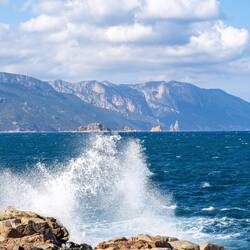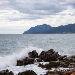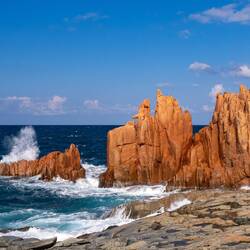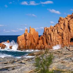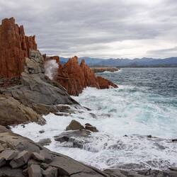 Weiter geht es zurück auf die schöne Panoramastraße SS125 und wir fahren nochmal nach Arbatax; zum einen um nochmal alle Dusty-Services durch zu führen, zum anderen um nochmal die roten Felsen zu besuchen, die heute wunderbar von der Sonne angestrahlt werden. Der Wind ist aber nach wie vor recht böig, sodass auch die Brandung wieder ordentlich ist. Wir bannen nochmals einige Bilder auf die Speicherkarte bevor wir zu unserem heutigen Tagesziel, dem Wanderparkplatz für die morgige Wanderung aufbrechen.