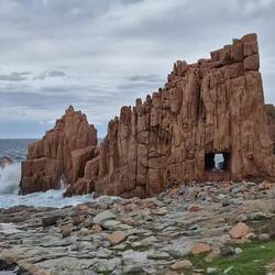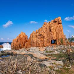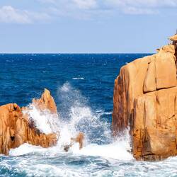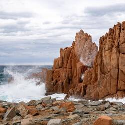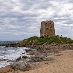 Heute morgen ist es leider wieder erwarten bewölkt, was uns aber nicht davon abhält zum Torre di Bari zu fahren. Der Turm liegt auf einer kleinen vorgesetzten Landzunge im Meer, die nur bei Ebbe zu erreichen ist. Leider gibt es zu viel Wind und Wolken so das die prächtigen Farben nicht ganz so zur Geltung kommen. Nichtsdestotrotz machen wir einen ausgiebigen Fotostopp bevor es weiter nach Arbatax geht. Nachdem es gerade 3 Regentropfen gibt, nehmen wir das zum Anlass den obligatorischen Cappuccino zu trinken. Anschließend laufen wir zu dem roten Felsen mit einem quadratischen Loch, der hier an der Küste steht. Die Farben kommen mit den Wolken leider auch hier nicht so zur Geltung, dafür gibt es tolle Wellen die an die Küste branden. Gar nicht so einfach ein schönes Gischt-Foto zu schießen.