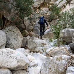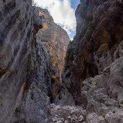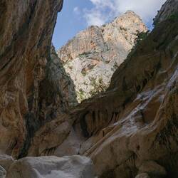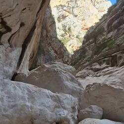 Die ersten Meter geht’s noch recht einfach über Schotter und etwas größere Steine, aber je tiefer wir in den Canyon vordringen, desto größer werden die Brocken und ab & an ist beim Überwinden der steinernen Barrieren Hilfestellung angesagt. Aber mit vereinten Kräften schaffen wir es bis zum ersten roten Marker 💪 - hier ist dann aber auch Schluss mit lustig. Hier am Ende des „gelben“ Streckenabschnitts stehen wir unterhalb einer 500 m hohen Wand und die Breite des Canyons ist hier an der schmalsten Stelle nur 4 m breit…. Italiens tiefster Canyon lässt uns ehrfürchtig in die Höhe und auf die gewaltige Pracht der aufragenden Wände schauen…. Wahrlich ein grandioser Ort!!