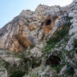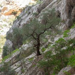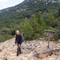 Um 9 Uhr wandern wir frohgemuts los zuerst ca. 50 Hm hinauf und dann rund 500 Hm hinunter zur Bucht. Die Strecke ist bis auf wenige steinige Passagen viel besser zu laufen als erwartet und führt durch die typische Karstlandschaft und durchläuft einen wunderschönen Oliven/- und Steineichenwald.