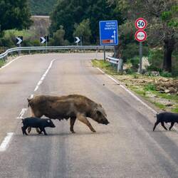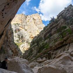 Für heute haben wir die Wanderung zum und in den Gorropu Canyon geplant, aber als wir wach werden ist der Himmel total bedeckt. Aber gegen 9 Uhr sehen wir am Ende des Tals die ersten blauen Lücken zwischen den Wolken und so beschließen wir schon mal zum Parkplatz für den Start der Wanderung zu fahren. Gegen 10 Uhr kommen wir dort an und unterwegs haben wir schon gesehen, dass die Wolken immer weiter abziehen. Also packen wir alles zusammen und gegen 10:30 Uhr wandern wir los Richtung Schlucht. Der Weg geht immer wieder bergauf und bergab und bietet tolle Ausblicke auf die riesigen Wände aus Karstgestein, die immer näher kommen. Größtenteils laufen wir durch den Wald der deutliche Anzeichen der hiesigen Wildschweine zeigt, aber zu sehen bekommen wir (zum Glück 🤔) keine.