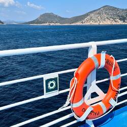 Heute morgen um kurz nach Sieben klingelt der Wecker: steht doch die Rückfahrt aufs Festland und das Ende unseres Sardinien Aufenthalts an. Ein letztes Team-Selfi, diesmal mit Milo und Dusty, wird geschossen, bevor wir uns pünktlich um 8 Uhr in Richtung Fähre auf den Weg machen. Der Weg ist nicht weit, 5 Minuten nach Abfahrt geht das Einchecken digital ruck-zuck über die Bühne und schon stehen wir neben der Fähre und haben genügend Zeit erstmal zu frühstücken.