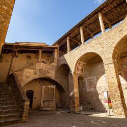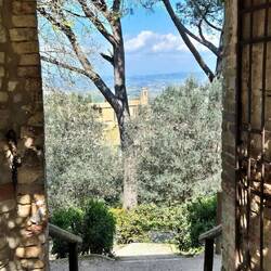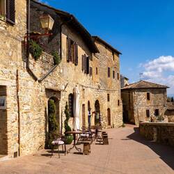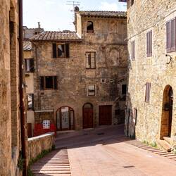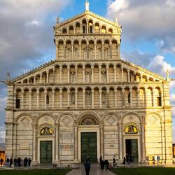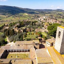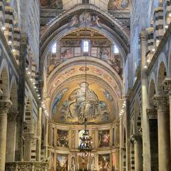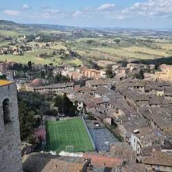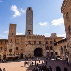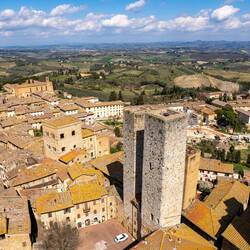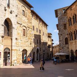 San Gimignano ist eine mittelalterliche Stadt, die durch eine aus dem 13. Jh. stammende Mauer umgeben ist und vor allem wegen ihrer „Geschlechtertürme“ bekannt. Wir laufen hinauf zur Piazza della Cisterna und weiter zu einem außerhalb liegenden Panorama Ausblick, bevor wir uns vor dem Dom in einem Café in der Sonne einen Cappuccino gönnen. Anscheinend ist heute "Wandertag" in den Schulen, ziehen doch die verschiedene Schülergruppen aller Altersstufen durch die Stadt. Anschließend erklimmen wir den höchsten Steinturm Torre Grossa mit 220 Stufen und genießen den Ausblick über die Stadt. Den Duomo di San Gimignano, aus dem im 12. Jh. besichtigen wir auch noch, bevor uns die inzwischen zahlreichen Touris in die Flucht schlagen und wir uns auf den Weg nach Pisa machen.