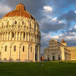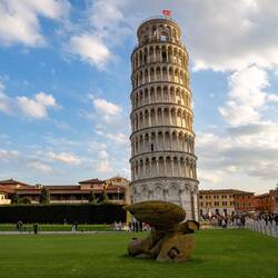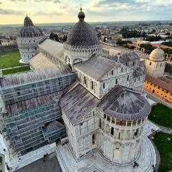 Hier parken auf dem Camper Stellplatz und laufen rund 30 Minuten in die Stadt. Es ist inzwischen mein dritter Besuch am schiefen Turm, für Dirk aber Premiere. Meine Erinnerungen an den letzten Besuch sind nicht so gut, war der Turm doch außen mit Stahlträgern abgestützt und die Rasenfläche total verwahrlost. Was für eine Überraschung dann heute, dass der Turm nun ohne äußere Hilfsmittel stabilisiert wurde und auch die Fläche um die Kathedrale gepflegt aussieht. Somit haben wir uns Tickets gekauft und den Turm erklommen. Ist schon ein witziges Gefühl auf der Wendeltreppe hinauf, wenn man sehr deutlich merkt ob man gerade eher "bergauf" oder "bergab" läuft. Wir genießen den Ausblick von oben und freuen uns dass sogar die Sonne nochmal heraus kommt.