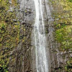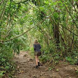 Kein Wunder, dass viele Urwaldfilme auf Hawaii entstanden sind. Riesiges Farn, wuchernde Ranken, tropische Pflanzen. Auf diesem Trail kommt man sich wie auf einer vergessenen Insel vor. Der WasserfallLue lisää