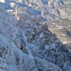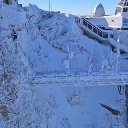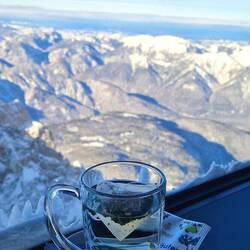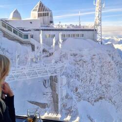 Die Wälder, Täler und Gebirgsketten der Alpen lagen nun weit unter uns. In der von außen vereisten Bergstation hatte man es hingegen warm und die Restaurantplätze boten einen fantastischen Ausblick.