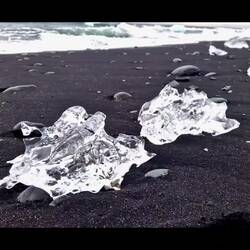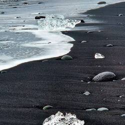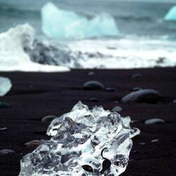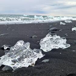 Da die Gletscher Lagune einen kurzen Zugang zum Atlantischen Ozean hat, wandern ein paar der Eisbrocken an den schwarzen Sandstrand. Das dort angespülte Eis hat dem Strand den Namen Diamond BeachBaca lagi