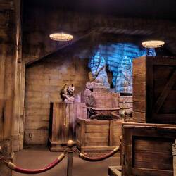 Im Anschluss besuchten wir den "American Waterfront" Bereich mit dem "Horror Hotel". Hierbei ergründet man das mysteriöse Verschwinden von dem Hotelbesitzer, der bei seinen Reisen ein verfluchtes Artefakt entwendet und zum Hotel gebracht hatte. In seiner Suite wurden wir ebenfalls verflucht und mit dem Fahrstuhl in einem rasanten Tempo bis zum Dach hochgeschossen, dort öffneten sich die Türen und gaben den Blick frei auf den gesamten Park in schwindelerregender Höhe, um anschließend im freien Fall wieder runterzufallen.