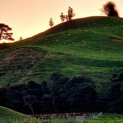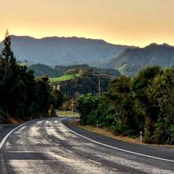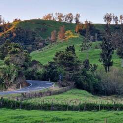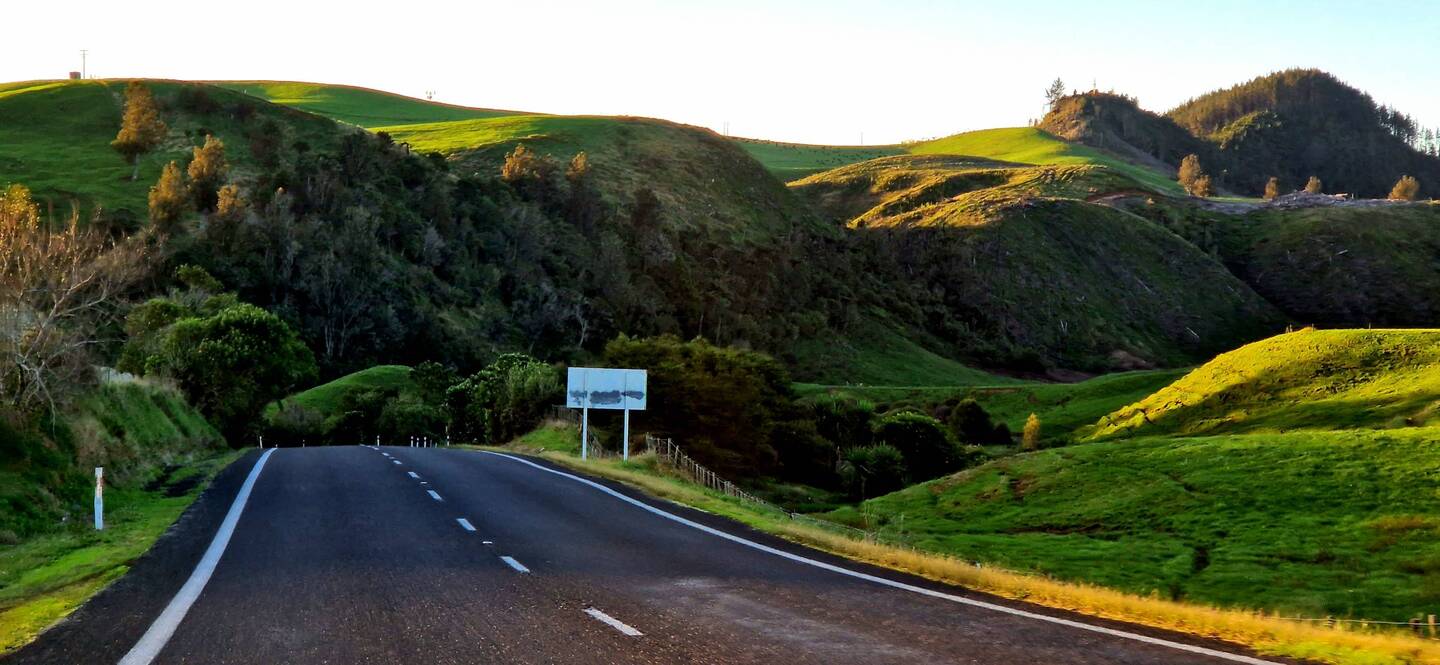 Auf der Waihi-Whangamata Road zwischen den beiden gleichnamigen Orten fuhren wir durch grüne Weiden und Hügel, die in der Abendsonne noch weicher aussahen.