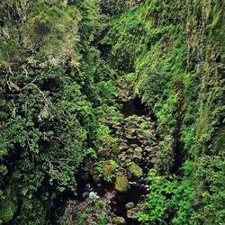 Oben angekommen fiel der erste Blick auf eine sattgrüne Schlucht und im Wind spielende Wolken.
