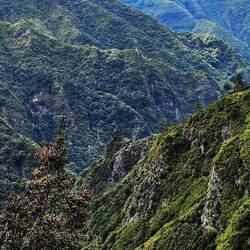 Der Blick vom Eira do Serrado ins Nuns Valley. Im Jahre 1566 flohen die Nonnen aus dem Kloster Santa Clara vor Piraten, die Funchal angriffen, und fanden hier im Kessel zwischen senkrechten BergenLeer más