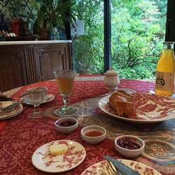 Monsieur empfängt uns mit einem liebevoll zubereiteten Frühstück im Gartenzimmer. Die üppige Vegetation von draußen setzt sich durch eine Tapete mit Pflanzenmotiven im Zimmer fort. Durch eine Glasfront schauen wir in den Garten. Das Frühstücksporzellan mit Gartenmotiven passt perfekt zur Tischdecke. Monsieur bereitet frisch Spiegeleier vor, es gibt knusprige Croissants und warmes Brot, dazu verschiedene Konfitüren, selbst gemachtes Rhabarberkompott, verziert mit frischen Himbeeren und Camembert, sowie Apfelsaft aus der Normandie - was will man mehr. Es ergibt sich ein interessantes Gespräch unter Gartenfreunden. Monsieur Bertrand ist passionierter Gärtner, so wie ich auch.