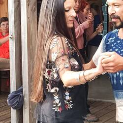 Als wir abends gegen sieben wieder dort eintreffen, ist die Veranstaltung schon voll in Gang. Eine Sängerin singt sehnsuchtsvolle , mexikanische Lieder und wird von einem Bandoneonspieler begleitet. Kinder. Junge und Alte sitzen zusammen und schwatzen bei Wein, Cola oder Bier. Die ersten Tänzer wagen sich vor. Es wird getanzt, mitgesungen und geklatscht. Alter, Aussehen und Kleidung - egal. Ob Jogginghose oder elegantes Kleid, niemand nimmt davon Notiz. Selbst ein Herr im Schottenrock erregt kein Aufsehen. Alle haben Spaß und als dann noch die Sonne hervorschaut, ist das Glück perfekt. Ich nippe an meinem Kir breton ( Cidre mit einem Schuss Cassis) , singe und klatsche mit, genieße die Leichtigkeit....Read more