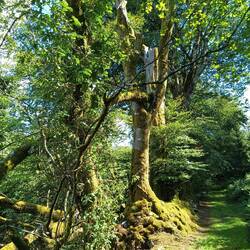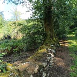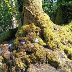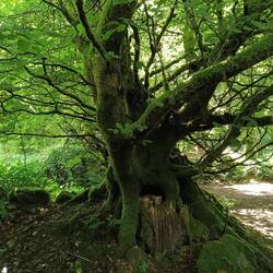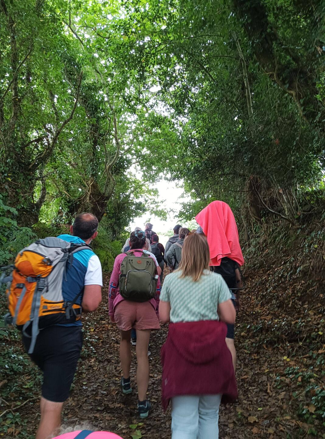 Terroir et mer- das ist die französische Bezeichnung für das Landesinnere und die Küste. Wir sind hier in Botmeur im terroir und am Morgen strahlt die Sonne vom Himmel. Wir frühstücken draußen und genießen die Wärme. Anschließend unternehme ich einen Spaziergang und gerate auf märchenhafte Wege. Der Wald ist wegen der starken Winde nicht sehr hoch gewachsen, aber die Bäume krallen sich mit ihren Wurzeln in die Felsen, wegen der vielen Feuchtigkeit bilden sich Flechten an den Bäumen. Kein Wunder, dass es hier Geschichten von Hexen und Druiden gibt....Etwas abseits vom Weg sitzt eine Gruppe von Menschen und Gitartrenklänge wehen herüber. Ich meine, die Stimme unseres Wanderführers Yuen zu hören. Vielleicht ist gerade eine Veranstaltung der ADDES im Gang, ich weiß es nicht....Immer wieder habe ich auch schöne Ausblicke auf den Lac St Michel.