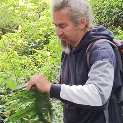 Heute empfängt uns wieder Yeun, deutlich älter geworden, wie wir alle, und bricht mit uns zu einer Wanderung entlang der felsigen Hügel auf. Wir sind eine Gruppe von fast 20 Personen. Yeun hat ein großes Pflanzenwissen und interessiert sich sehr für die Geologie der Monts d' Arreé. Schnell zieht er die Kinder in seinen Bann, indem er aus Adlerfarn eine Krone bastelt oder aus Binsen eine Rassel, die er mit kleinen Eicheln füllt. Er erklärt, dass man aus den jungen Trieben der Brombeeren Hustentee kochen kann und mit den langen Trieben, von denen man Stacheln und Blätter entfernt, Körbe flechten kann. Er zeigt uns Granit, Quarz,Sandstein und Schiefer , alles Gesteine, aus denen die Monts d' Arreé bestehen. Von einem felsigen Hügel aus erklärt er uns die Gegend. Mir gefällt die Einsamkeit in der kargen, von Heidekraut geprägten Landschaft. Immer wieder sehen wir die kleine Kirche St Michel de Brasparts auf einem kahlen Höhenzug, zu der wir an einem anderen Tag wandern wollen.Read more
