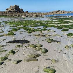 Zurück am Haus, wird es Zeit , in Richtung Plouescat , ans Meer, aufzubrechen. Dort sind wir mit zwei französischen Lehrerinnen, Genevieve und Christine, verabredet. Wir haben die beiden im letzten Jahr in Irland auf dem Wild Atlantic Way kennengelernt und einen schönen Abend auf dem Campingplatz miteinander verbracht. Als ich Genevieve vor ein paar Tagen angefunkt habe, war sie ganz begeistert und so haben wir uns heute auf einen Kaffee im Strandrestaurant Roch ar Mor verabredet. Die beiden haben ihre drei Enkel dabei, sieben und fünf Jahre alt, die zwischen den großen Steinen am Strand spielen, so, wie Julian und Lucas es vor 20 Jahren getan haben - ich bin gerührt. Wir reden über Gott und die Welt auf der Holzveranda des Restaurants und freuen uns über das Wiedersehen. Wenn Genevieve vom Erasmus- Programm ihrer Grundschule erzählt, das sie mit aufgebaut hat, leuchten ihre Augen. Sie war gerade in Schweden und hat dort verschiedene Grundschulen mit sehr interessanten naturnahen Konzepten besucht und hofft , einen Austausch mit einer Schule in Portugal aufbauen zu können. Christine, ehemalige Lehrerin am College, begleitet sie oft als Mit- Betreuerin für die Kinder. Unsere Grundschule bei Erasmus zu installieren, das würde mir richtig Spaß machen.... Mal schauen, ob ich Mitstreiterinnen finde....Jedenfalls gibt es jetzt eine WhatsApp -Gruppe von uns dreien zwecks Erfahrungsaustausch.