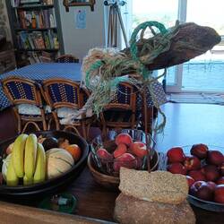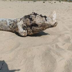 Andreas, Marie und ich laufen einen langen Strand entlang, das Wasser glitzert in verschiedenen Blautönen und wir finden Muscheln und Steine in verschiedenen Farben und Formen.Schon baldl füllen sich Hosentaschen und Beutel. Manchmal schwemmt der Ozean auch ganze Baumstämme an. So einen entdecken wir, seine abgebrochene Wurzel sieht aus wie ein Nashorn - oder Drachenkopf. Andreas nennt ihn Dragonix und Marie will ihn unbedingt mitnehmen, um daraus eine Skulptur zu machen. Wir beschließen, nachmittags mit Säge und Handwagen wiederzukommen ....Zunächst backen Marie und ich aber mall einen Clafoutis mit Reniclauden als Dessert für das Mittagessen.