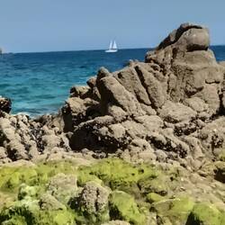 Am späten Vormittag gehen wir zum Plage de la fontaine. Dort steht ein kleines Brunnenhaus, an dem bis in 50er Jahre hinein die Kinder des Dorfs Wasser holen mussten. Die Insel wurde erst in den 50er Jahren mit fließendem Wasser und Strom versorgt. Ich schwimme wieder im blauen Meer und freue mich am Anblick der Segelboote.