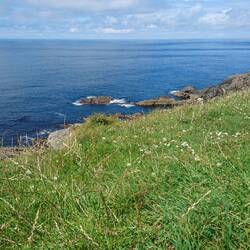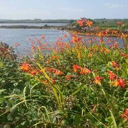 Nach dem Frühstück brechen wir zum St. John's Point auf. Das ist eine Felsnase am Ende einer langen, schmalen Landzunge, die gegenüber von unserem Campingplatz ins Meer ragt. Auf einem schmalen Sträßchen fahren wir zwischen Blumenwiesen dorthin, zu beiden Seiten ist das Meer zu sehen und jeweils dahinter blaue Bergketten. Wir parken an einem kleinen Sandstrand, da erwischt uns der nächste Guss. Fasziniert beobachten wir, als es aufklart , wie das Meer seine Farbe wechselt von düster hin zu einem hellen Türkis. Der Weg zu Felsnase und Leuchtturm führt weiter durch Blumenwiesen, in denen ich wilde Orchideen entdecke. Der weite Himmel mit dramatischen Wolkenbildern, das glitzernde Meer und der Ausblick auf die Bergketten begeistern mich.