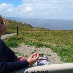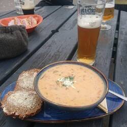 Dann fahren wir weiter nach Crookhaven, einem kleinen Hafenörtchen, das auf einer Landzunge zwischen einer Hafenbucht und dem Atlantik liegt. Dort waren Andreas und ich schon im Herbst und fanden es dort im Pub O'Sullivan bezaubernd schön. Im Oktober waren wir fast die einzigen Gäste. Jetzt geht es im Örtchen lebhaft zu. Wir setzen uns draußen ans Pier und kaum sitzen wir, trifft Lucas Bernadette, die ehemalige Leiter der Kunstschule aus Macroom. Die beiden habwn sich im Konvent kennengelernt, wo Lucas in der Skulpturenwerkstatt arbeitet und Bernadette als Keramikkünstlerin die Kunstschule geleitet hat. Auch hier ergibt sich wieder ein herzliches Gespräch mit ihr und ihrer Freundin .ich esse ein köstliches Seafood Chowder, eine Art Fischsuppe mit ganz viel Gemüse, sehr lecker!