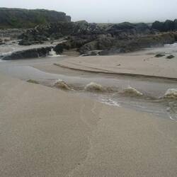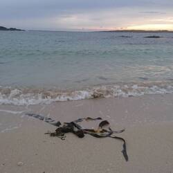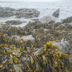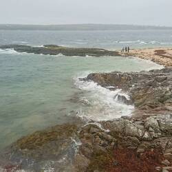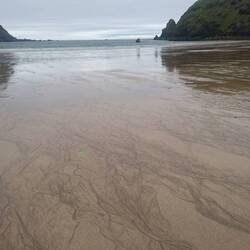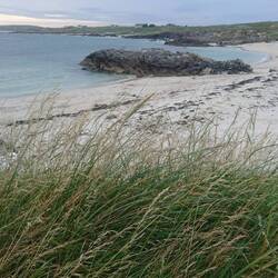 Ehrlich gesagt geht das Stimmungsbarometer ziemlich runter, als wir heute Morgen aus dem Fenster schauen: Nieselregen und Nebel, keine guten Bedingungen, um den Ring of Beara zu fahren.... Wir machen uns dennoch auf den Weg, wollen sehen, was möglich ist. Zunächst sehen wir von der Landschaft kaum etwas, Die Berge sind im Nebel verschwunden, die Küstenlinie können wir nur erahnen. Die Straße ist schmal und windet sich an den Bergen entlang. Als es noch höher hinauf geht, wendet Andreas in einer Hofeinfahrt. Bei diesem Nebel ist uns das Fahren mit kaum Sicht und unübersichtlichen, schmalen Straßen zu gefährlich. Wir fahren stattdessen in Richtung Allihies, immer am Meer entlang, die Sicht wird etwas besser und wir halten am Allihies Beach, einem wilden, scheinbar einsamen Strand. Das ist das Witzige hier in Irland: Man hält, scheinbar ist man der einzige Mensch in der Landschaft und was steht am Zugang zum Strand? Ein kleiner Foodtruck mit gutem, heißen Kaffee und Tee, sowie leckeren Sandwiches. Ganz oft haben wir das schon so erlebt. Ich kann nicht widerstehen und kaufe mir einen Latte und ein Crab Roll, ein lecker mit selbst gemachtem Krabbensalat gefülltes Hotdog- Brötchen. Das genieße ich mit Blick auf die wilde Bucht. Dabei kommen wir mit dem jungen Paar ins Gespräch, das den Foodtruck betreibt. Er erzählt, dass er ein Jahr in Bonn studiert hat und ist gleich mit Andreas um Austausch, der dort auch studiert hat. Die Welt ist mal wieder ein Dorf.... Wir gehen am Strand spazieren und fotografieren, es regnet gerade mal nicht.