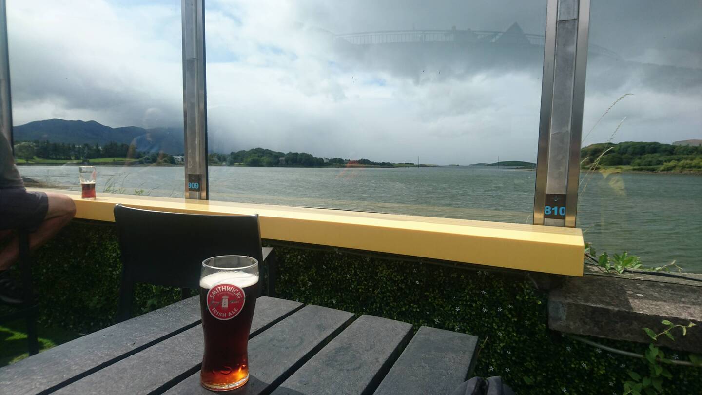 Als wir im Hafen von Westport eintreffen, ist der Himmel wieder blau, die Sonne scheint. Wir lassen uns in einem Biergarten mit Blick auf die Hafenbucht mit vorgelagerten Inselchen und Blick auf den Croagh Patrick nieder und genießen die Wärme der Sonne.