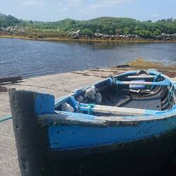 Da es morgen in den Süden von Connemara geht, haben wir uns entschieden, die nordwestlich von uns liegende Mullet Peninsula zu erkunden. Zunächst geht es durch dichten Wald Richtung Bangor. Dann durchfahren wir eine moor- und heidebedeckte Hochebene, die von schroffen Höhenzügen eingefasst ist, den Ballycroy Nationalpark. Schließlich fahren wir durch ein Flusstal in Richtung Belmullet. So gelangen wir auf die zerklüftete Halbinsel, die einen ganz anderen Charakter hat als Achill Island, wo wir gestern waren. Die Mullet Peninsula ist ganz flach, besteht überwiegend aus Marschland und Wiesen, auf denen Rinder grasen. Wir folgen der Straße zum Südwestende der Halbinsel nach Blacksod. Unterwegs kommen wir an einem winzigen Hafenbecken vorbei. Inzwischen hat sich das Wetter aufgehellt. Beim Aussteigen stellen wir fest, dass es sich eher um einen Schiffsfriedhof handelt. Die meisten Schiffe sind sehr marode. Das Ganze hat einen morbiden Charme, wir machen viele Fotos.